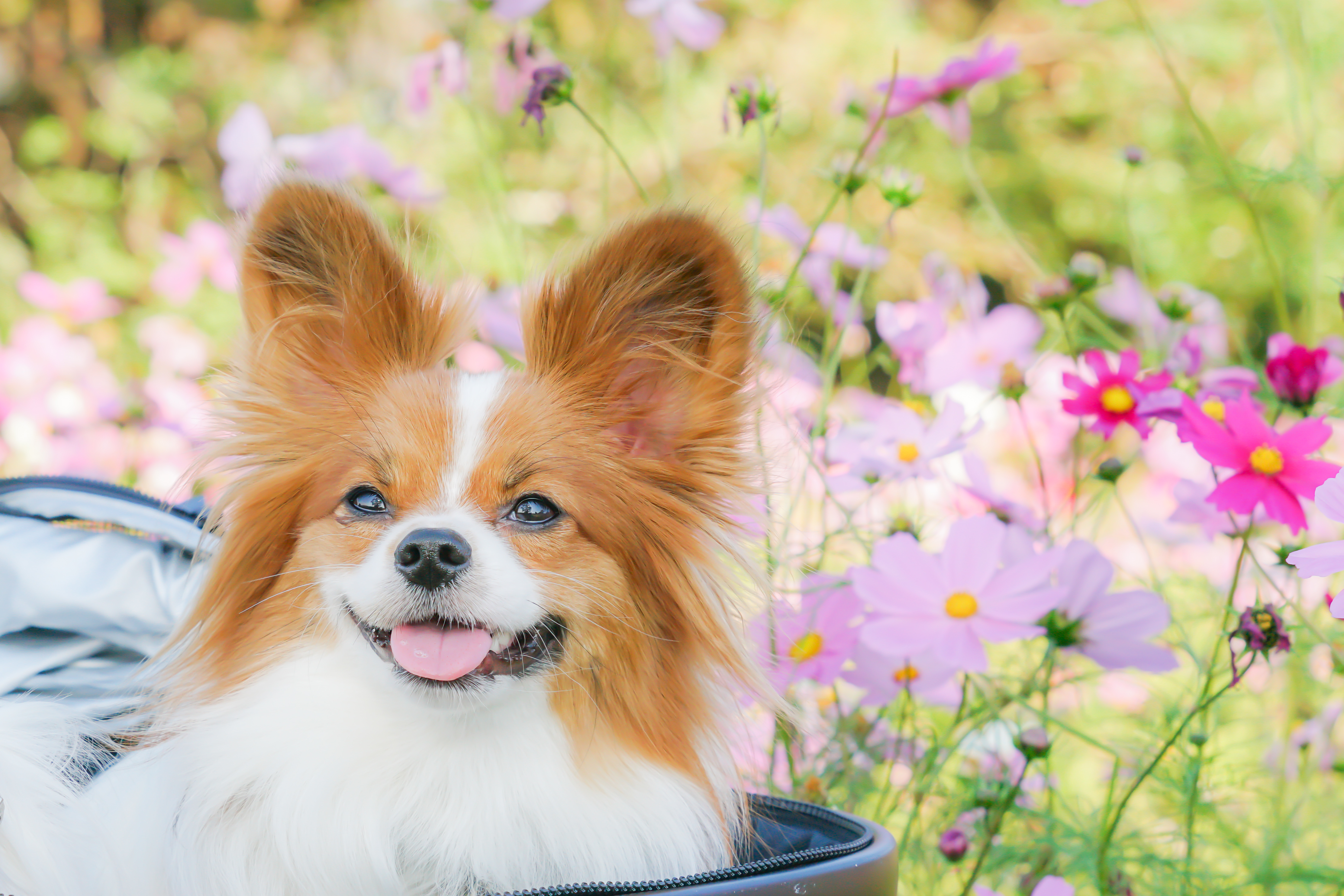 コスモスに囲まれた写真、初心者の私的には満足しています。カートではコスモスとの高さが合わなかったり、どちらかがしゃがんでしまい見えなくなったりで抱っこ撮りにしました。人間の赤ちゃんを抱っこして撮るようにわんこもありですね。