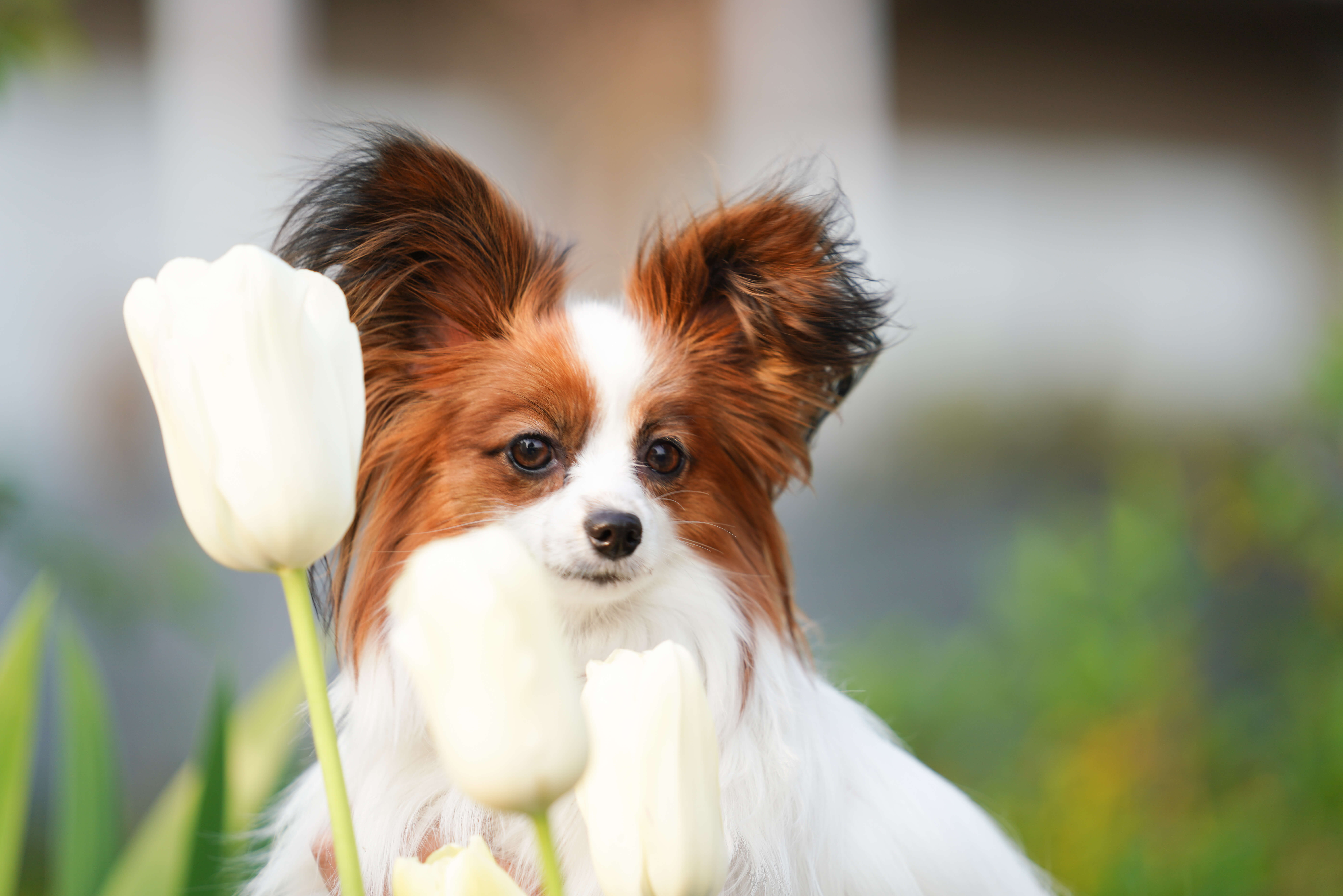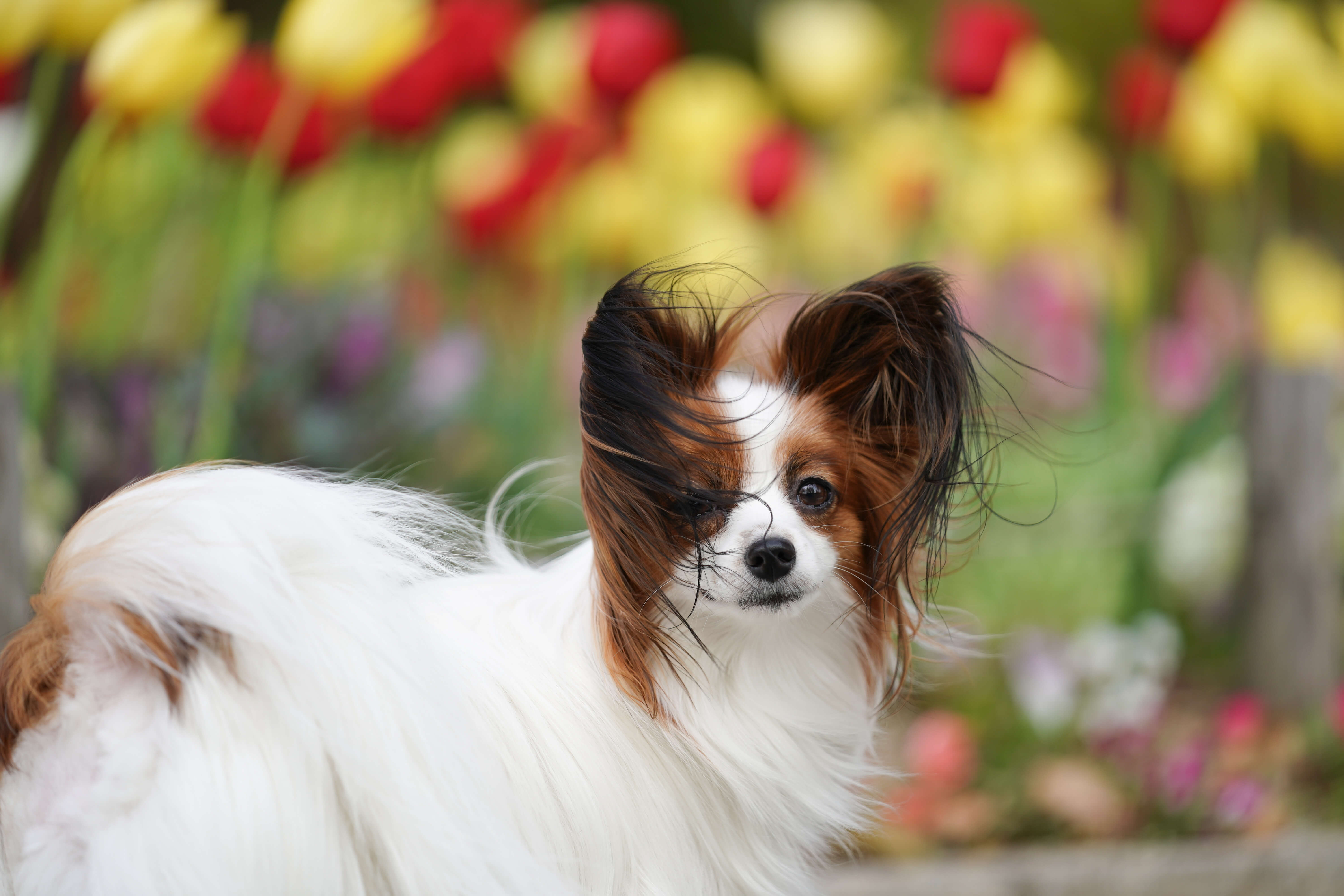 チューリップ花壇の前で。風で耳の飾り毛がくちゃくちゃです💧SEL70200GMは後ろボケが汚く感じることが多々ありましたが、改めて見ると悪くない気が・・(※四角辺りが円を描くように湾曲するのはα9の電子シャッターで撮っている影響のようで、他のレンズでも発生してます)