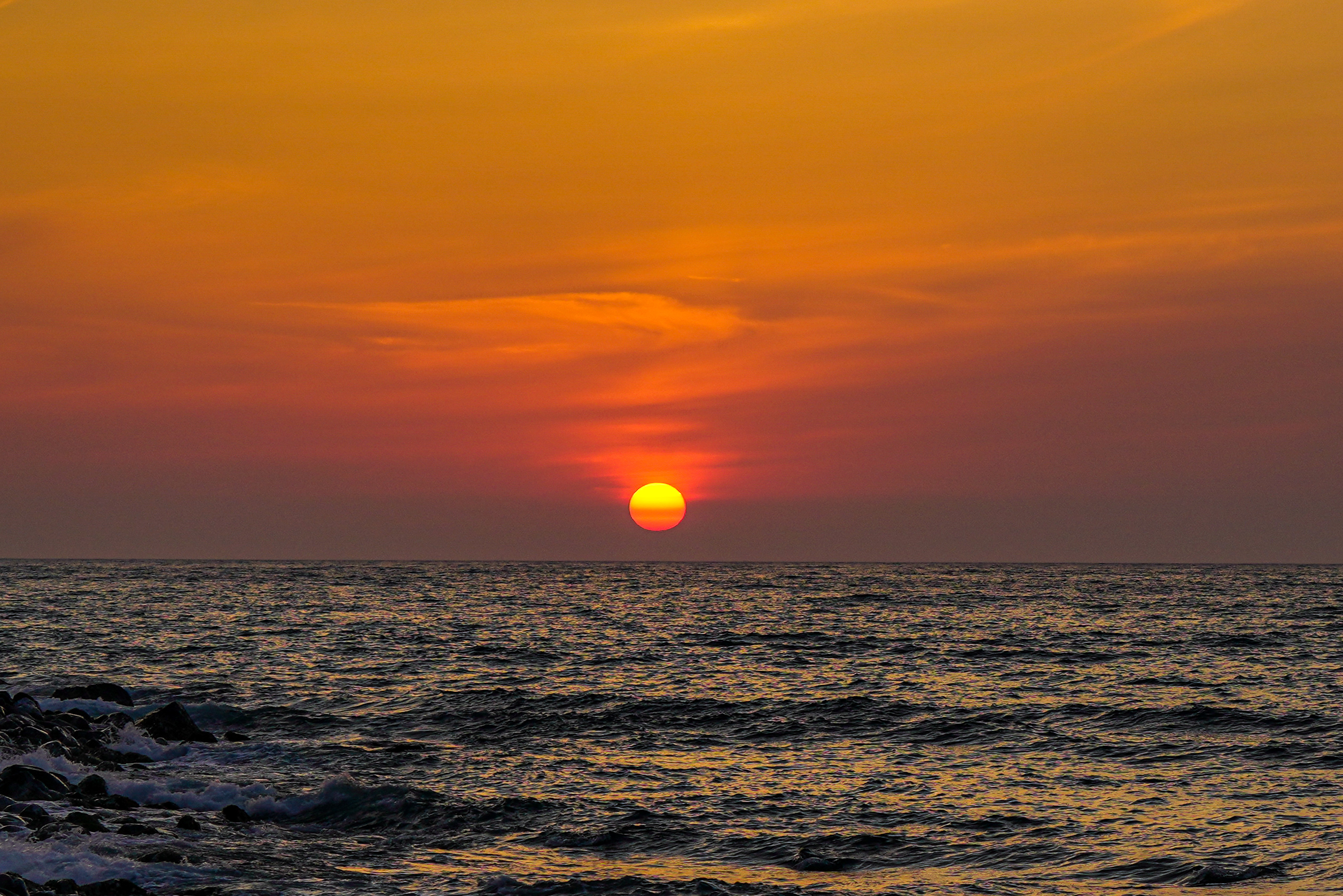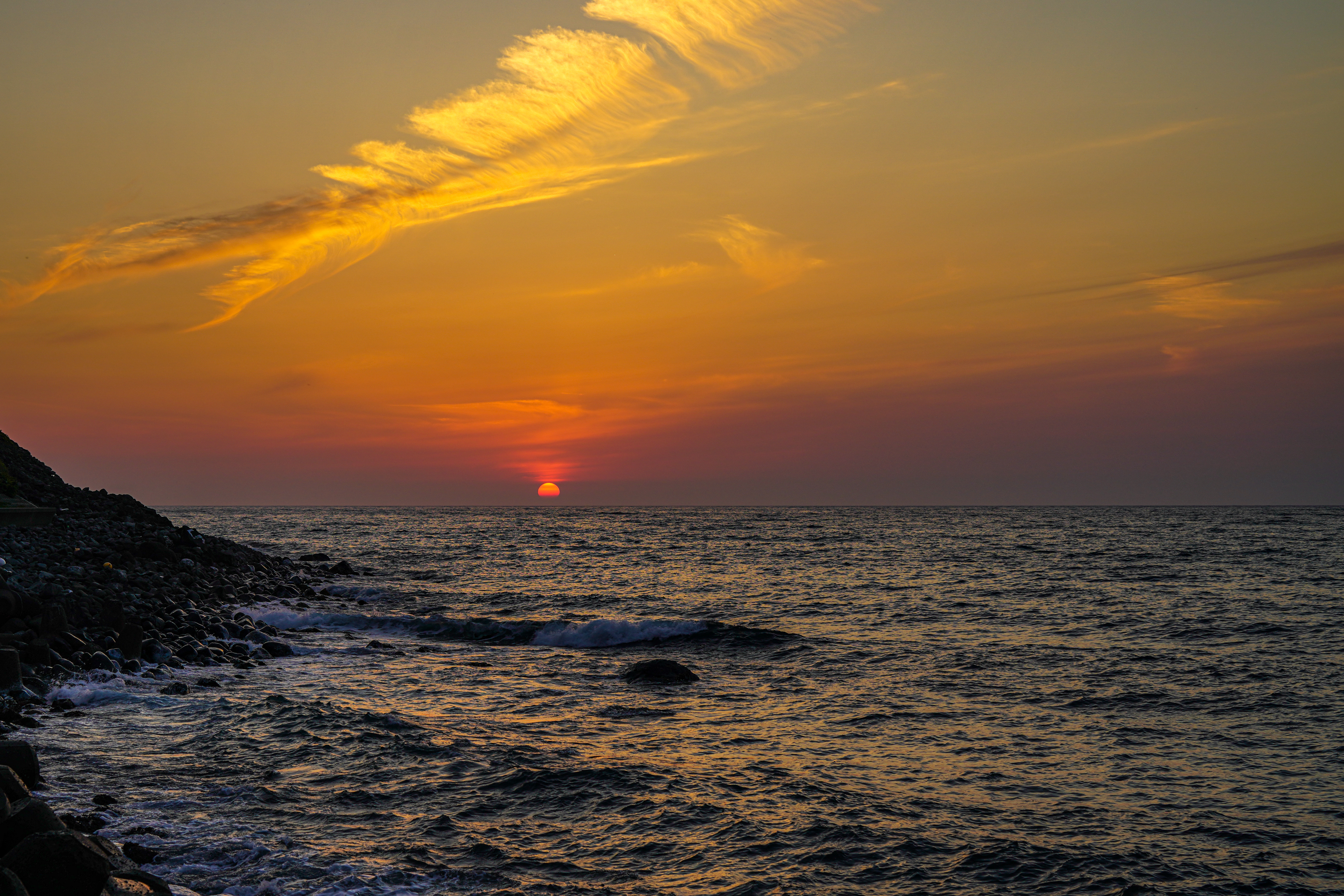 この日の写真は上手く撮れたほうだと思います。特に日没の写真はダイナミックに鮮明に撮れました。主役は夕陽ですが、この場所の雰囲気を出すために海はもちろん、空も入れました。何より、障害物がないのが嬉しいです。いつも構図には苦労しますが、ちょっと角度や位置を変えると良い写真になるので、そういうことを考えながら撮るのも楽しいです。今回は偶然撮影出来た日没のシーンや初めて挑戦したシルエット写真など、勉強になりました。