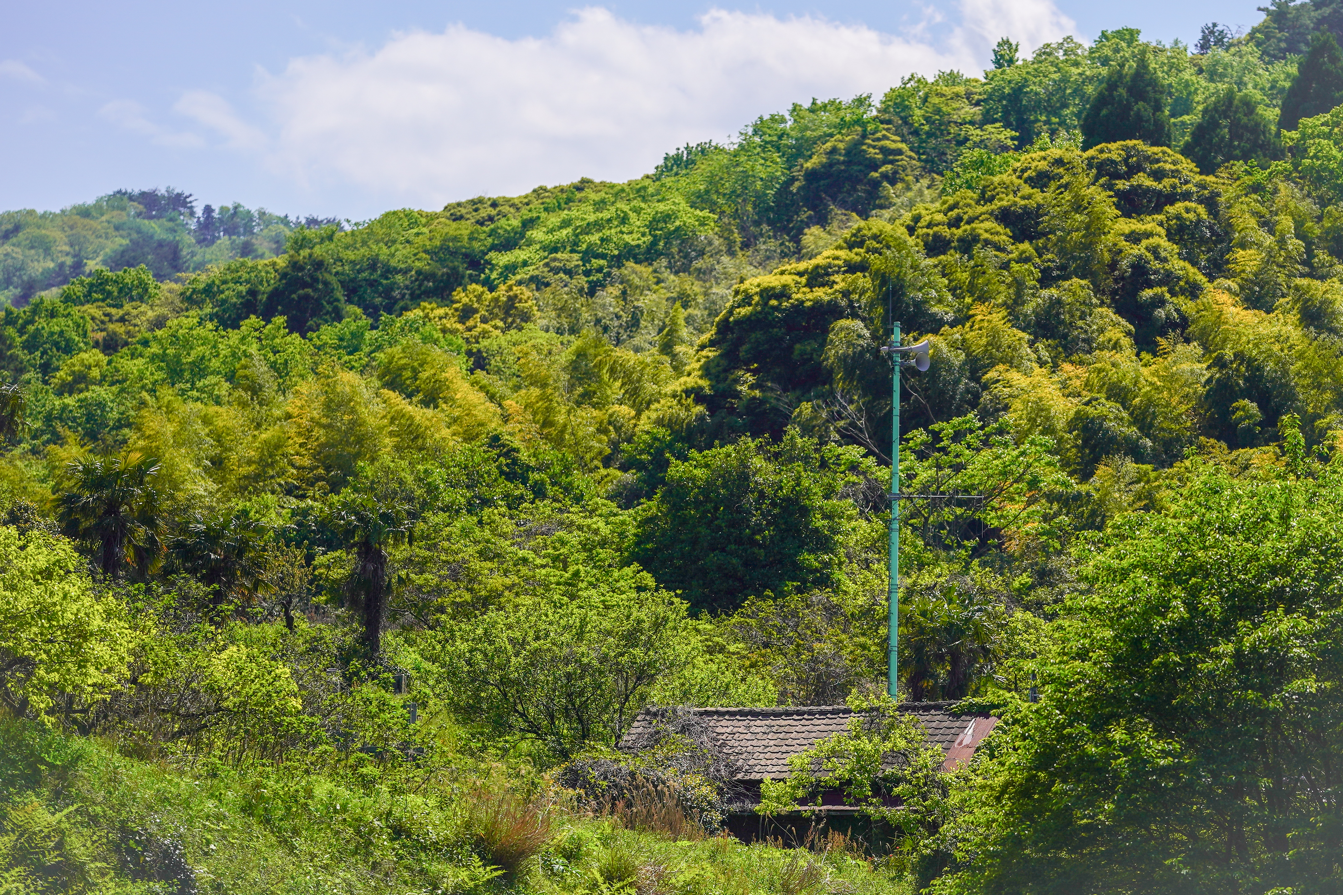 山に囲まれております。空き屋もチラホラ。町内放送のスピーカーがあるのも田舎らしい(笑)